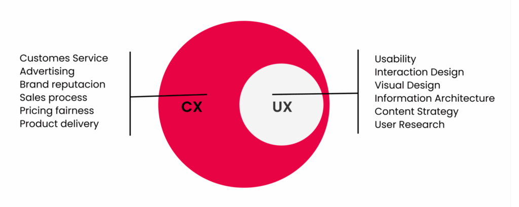 A user experience é diferente do customer experience, quando estamos falando de UX, é uma abordagem mais específica com relação a interação do usuário com o produto, enquanto o CX, é mais amplo, porque engloba a interação com a empresa em todos os seus pontos de contato (vendas, marketing, relacionamento com o cliente e produto).